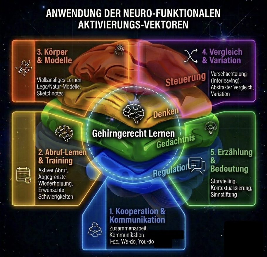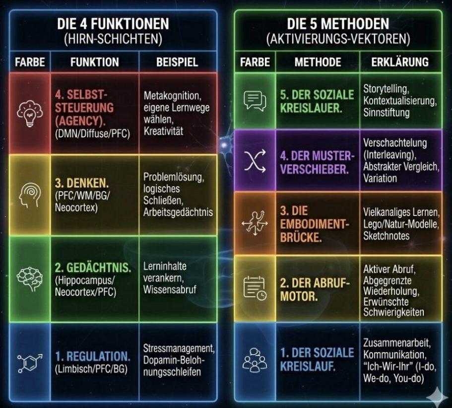 Vier Ebenen der Funktion des menschlichen Denkens und Lernens werden mit fünf methodischen Prinzipien gekreuzt, die die Besonderheiten ideal zu nutzen versuchen.