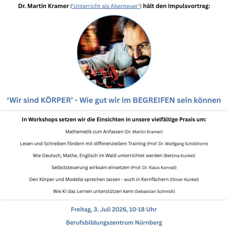 Der Mathematik-Didaktiker und Theaterpädagoge Dr. Martin Kramer zeigt 2026, wie unsere Körperlichkeit mit all unseren Sinnen menschliches Denken und Lernen einzigartig macht - eine hervorragende Grundlage für ein menschen-gerechtes und gehirn-gerechtes Lehrer-Verständnis.