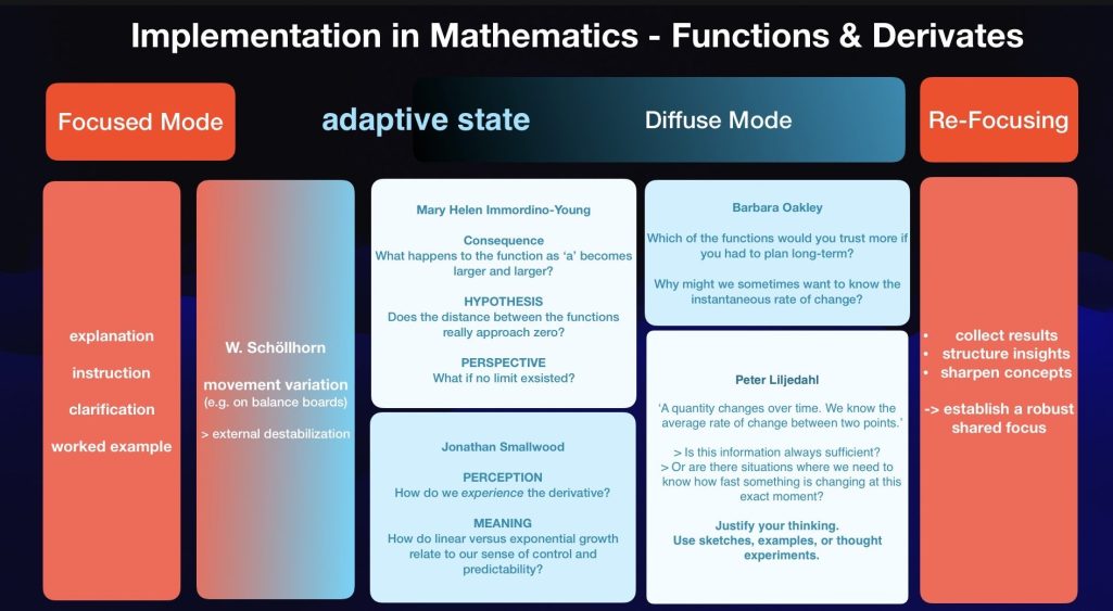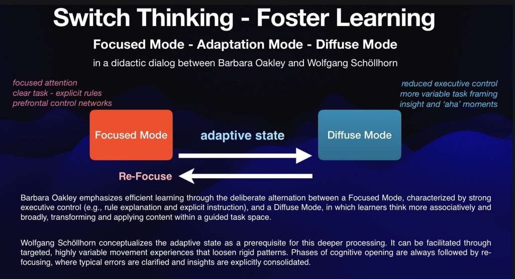 Der Wechsel zwischen fokussiertem Blick auf einen vorstrukturierten Gedanken etwa bei der Anwendung eines bekannten Rechenweges und dem frei assoziierenden Denken, das entfernte Gedanken zu einem komplexen Verständnis oder einer neuen, kreativen Idee zusammenfügt, ist ein Schlüssel zu kognitiver Leistung. Mit Barbara Oakley, Wolfgang Schöllhorn und anderen wollen wir dieses 'Switching Thinking' verstehen und sehen, wie es zu fördern ist.
